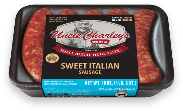 Serving Size:3 Total Time:30 Difficulty:Beginner INGREDIENTS. 1 packageUncle Charley’s Sweet Italian Sausage, sliced 2 tsp.Olive Oil 2 mediumYellow onion, diced Red pepper, diced Green bell pepper, diced Garlic salt INSTRUCTIONS....